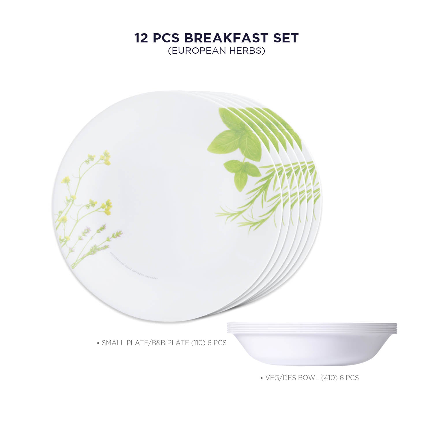 Corelle Asia Collection European Herbs Breakfast Set (Pack of 12) 6 26cm Dinner Plates, 6 296ml Dessert Bowl