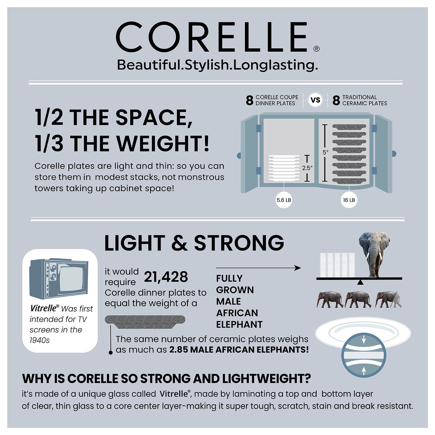 - Vitrelle glass is lightweight, easy to clean, light weight, consumer safe