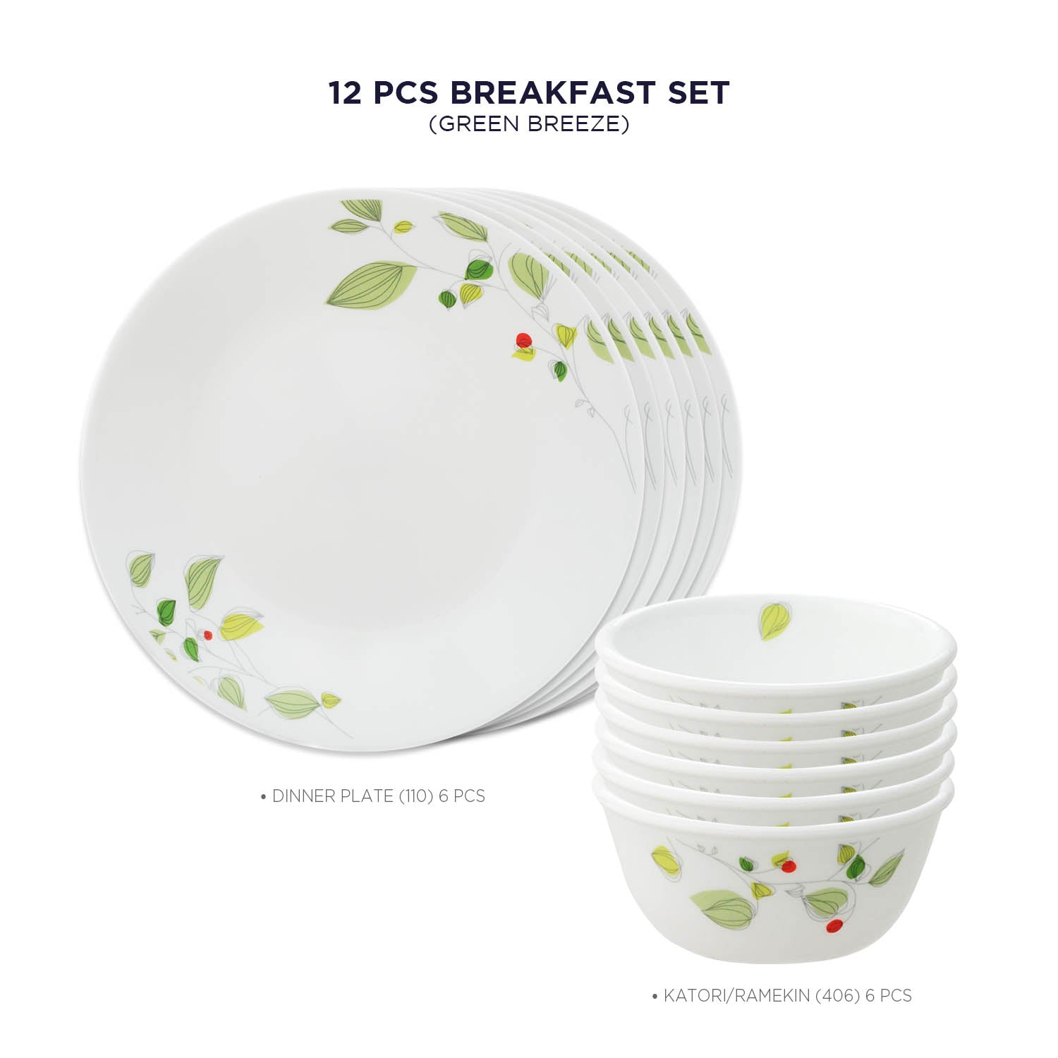 Corelle Asia Collection Green Breeze Breakfast Set (Pack of 12) 6 26cm Dinner Plates & 6 177ml Katori