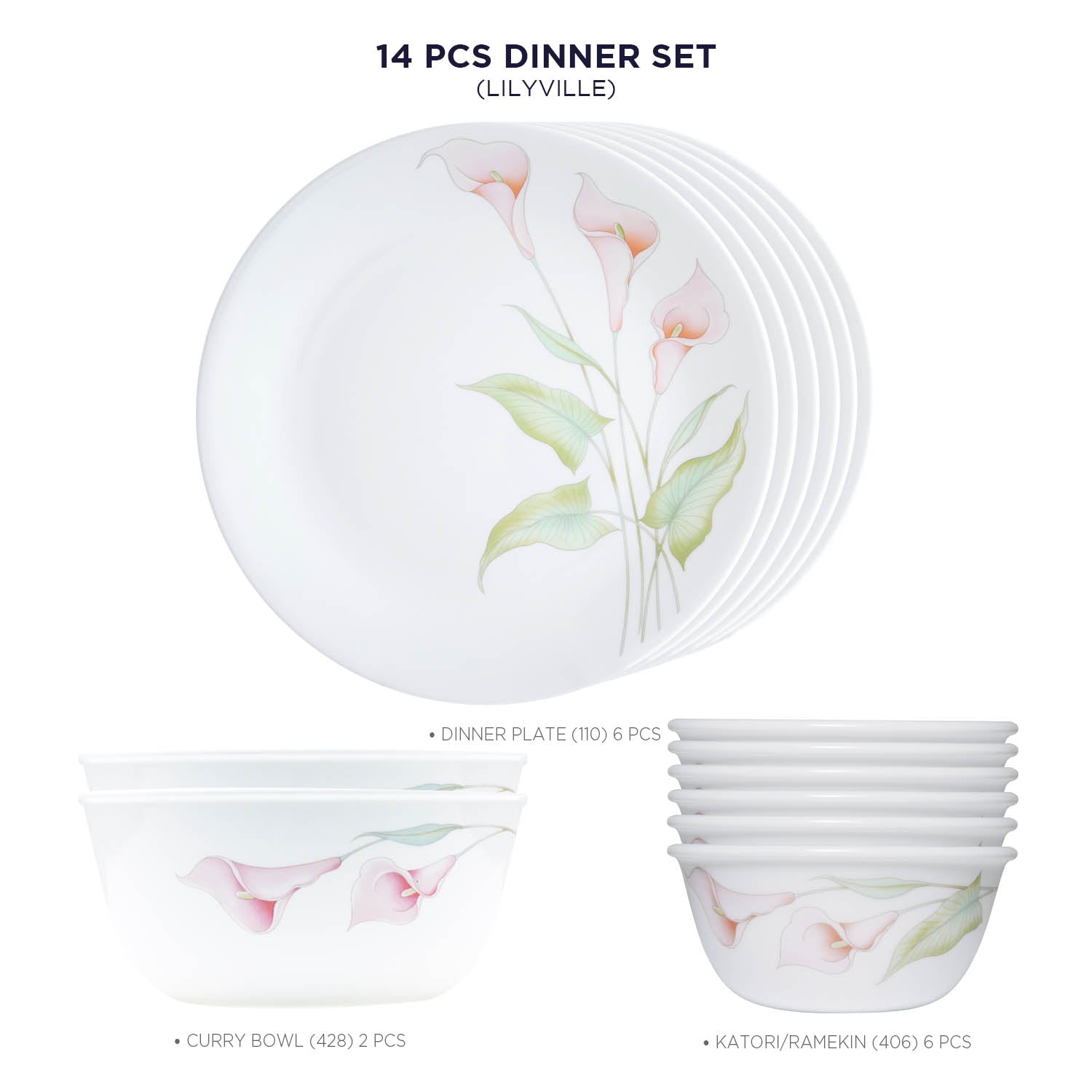 Corelle Asia Collection Lilyville 14 Pcs Dinner Set (Pack of 14) 6 26cm Dinner Plates, 6 177ml Katori, 2 828ml Curry Bowl