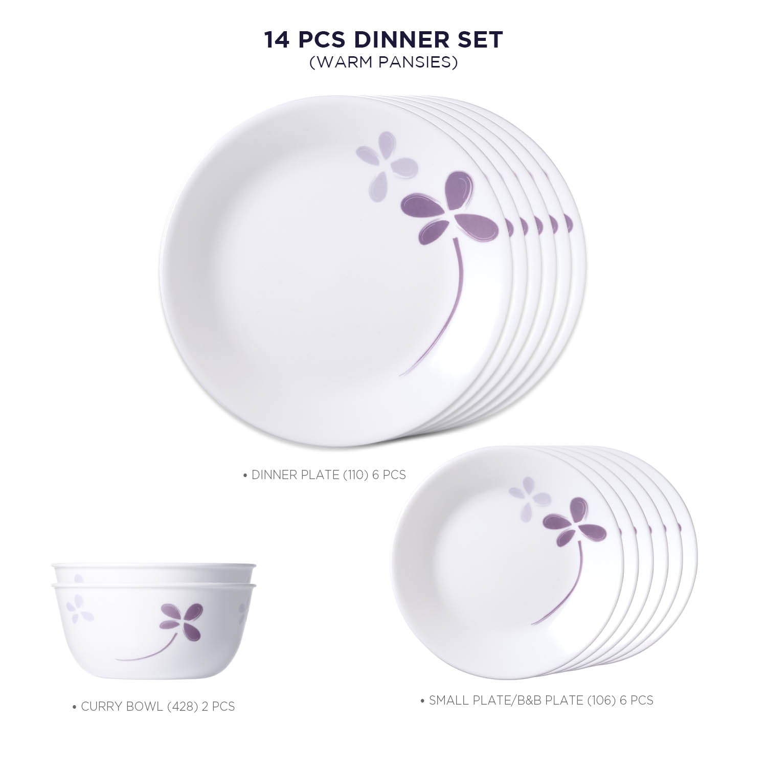 Corelle Asia Collection Warm Pansies 14 Pcs Dinner Set (Pack of 14) 6 26cm Dinner Plates, 6 17cm Small Plates, 2 828ml Curry Bowl