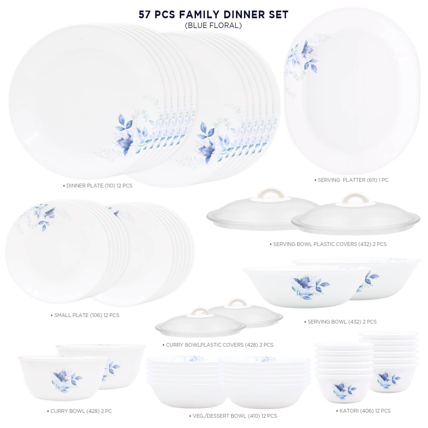 Corelle Blue Floral Dinner Set - 57 Pcs | For Family of 12 | Break & Chip Resistant | Lightweight & Durable | Microwave & Dishwasher Safe