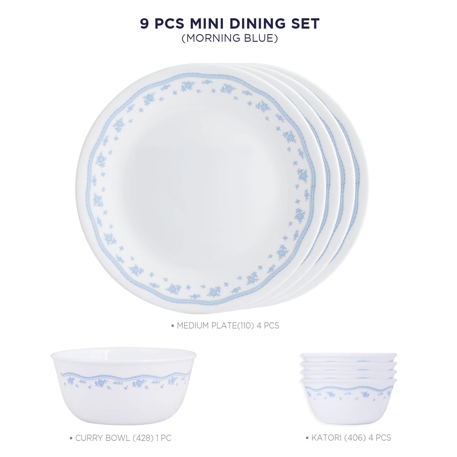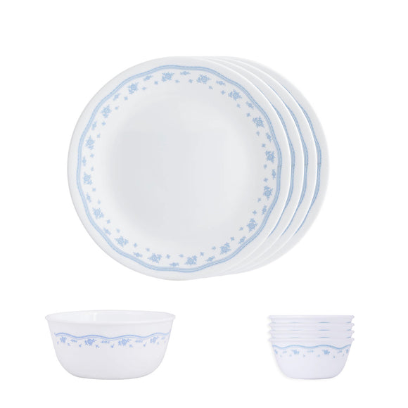 Corelle Livingware Morning Blue 4 26cm Dinner Plates, 4 177ml Katori & 1 828ml Curry Bowl (Pack of 9)