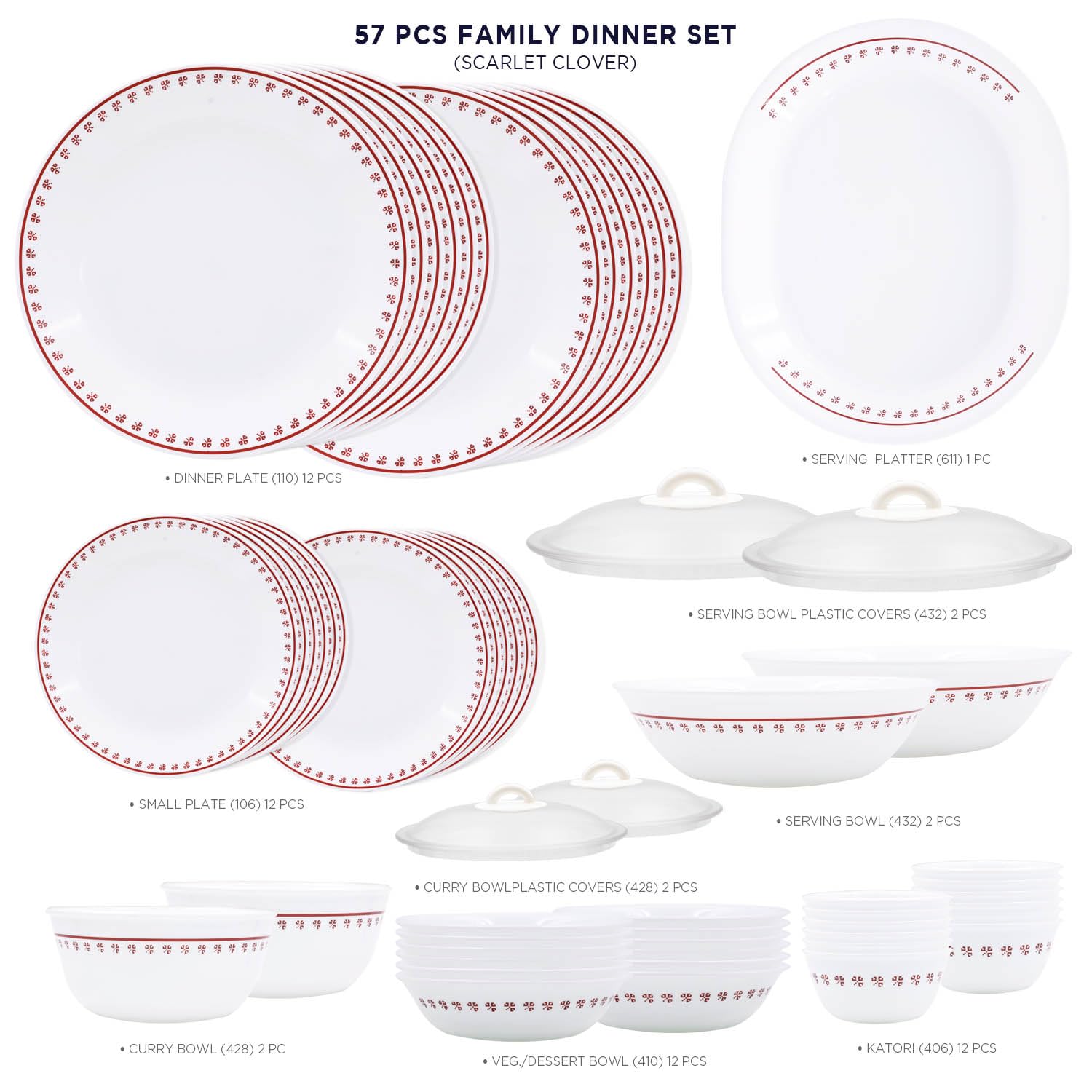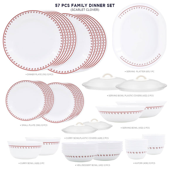 Corelle Scarlet Clover - 57 Pcs Dinner Set | For Family of 12| Break & Chip Resistant | Lightweight & Durable | Microwave & Dishwasher Safe