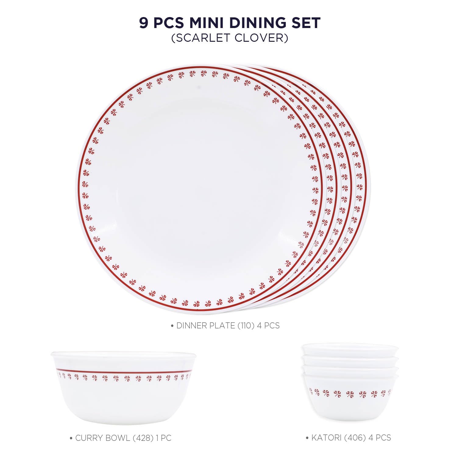 Corelle Scarlet Clover - 9 Pcs Mini Dining Set | For Family of 4| Break & Chip Resistant | Lightweight & Durable | Microwave & Dishwasher Safe