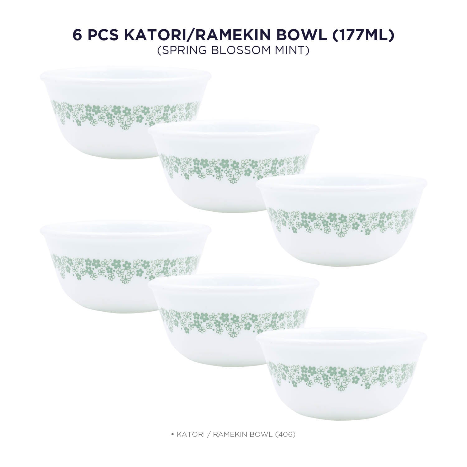 Corelle Spring Blossom Mint 177ml Katori / Ramekin Bowl Pack Of 6 | Break & Chip Resistant | Lightweight & Durable | Microwave & Dishwasher Safe